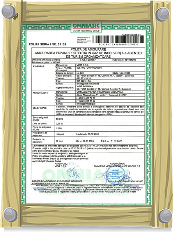 VISIT ROMANIA - dedicated travel agent, was founded and started operations on the Romanian market in 1994 and it was shortly recognized as one of the leaders in travel industry. As an international active tour-operator, member of several domestic and international travel organizations, VISIT ROMANIA is continuously developing and promoting professional travel industry services designed to meet the highest expectations in corporate, specialized and leisure travel.